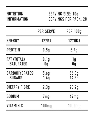 Immune Complex (Elderberry Juice Powder*, Acai Powder*, Sea Buckthorn Juice Powder, Amla Fruit Powder*, Lemon Juice Powder*, Boabab Powder*, Camu Camu Powder*, Goji Berry Juice Powder*, Mesquite Powder*, Acerola Powder*) Prebiotic Natural Fiber (Sunfiber® - Partially Hydrolyzed Guar Gum), Natural Berry Flavour, Stevia Leaf Extract, Monk Fruit